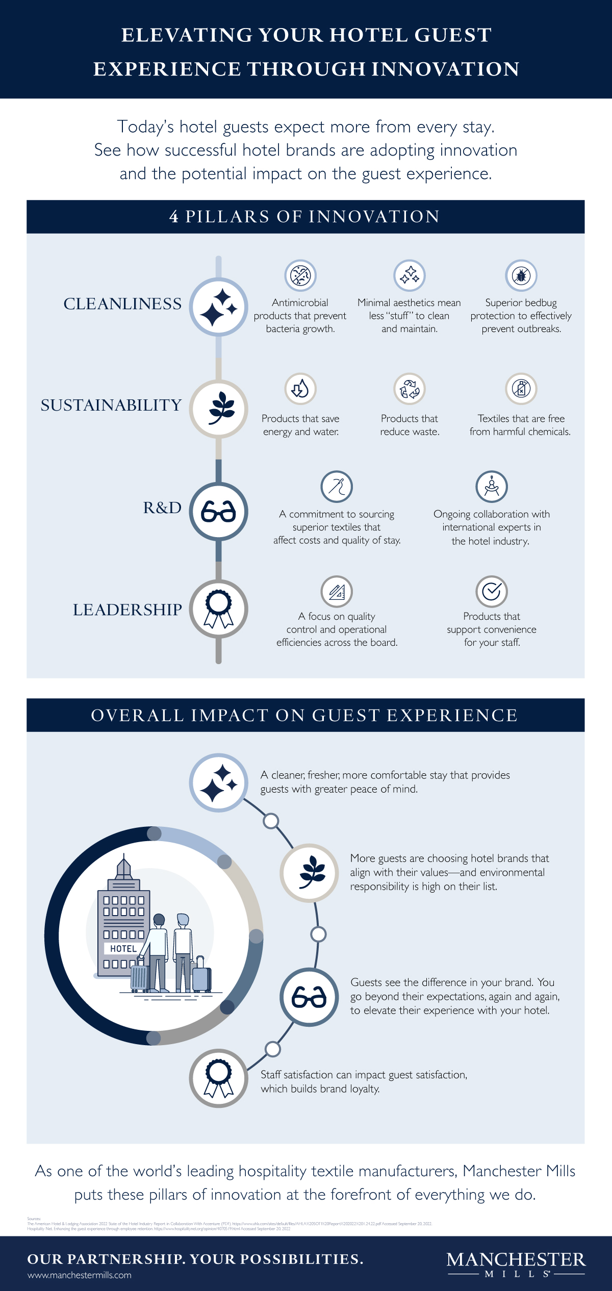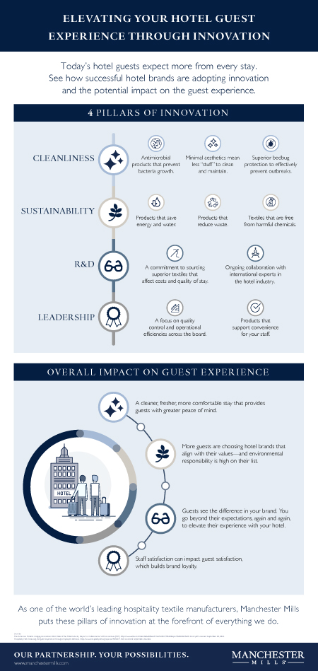 Today’s hotel guests expect more from every stay. Here are four pillars of innovation that successful hotel brands are adopting and the potential impact on the guest experience. As one of the world's leading hospitality textile manufacturers, Manchester Mills puts these pillars of innovation at the forefront of everything we do.
